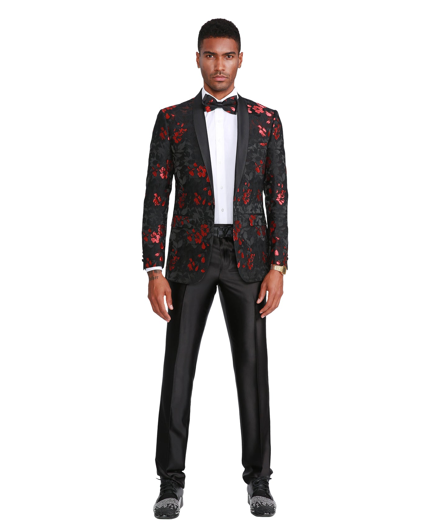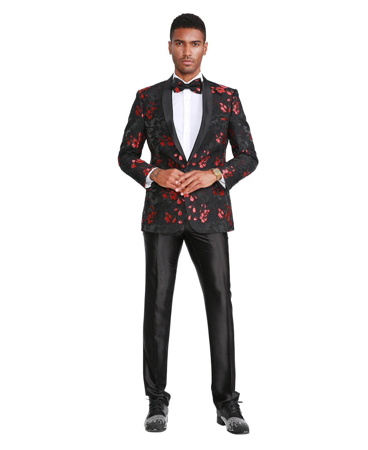 Men's Floral Slim-Fit Blazer w/ Satin Shawl Collar - Red/Black / 2XL / MJ341S-01