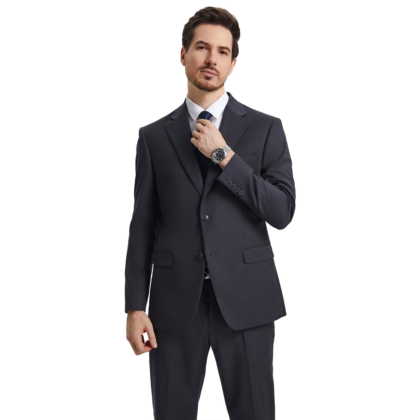 Introducing the Men's Barry's Menswear Hybrid-Fit 3pc Notch Lapel Suit Set in a sophisticated charcoal hue���a timeless embodiment of refined style and modern elegance. Crafted by the esteemed Barry's Menswear brand, this ensemble seamlessly blends tailored precision with the comfort of a modern silhouette. The jacket features a classic Notch Lapel and a Hybrid Fit, boasting functional elements like a two-button front closure, French facing, and underarm sweat guards. Complementing the jacket, the vest showcases a V-shaped design, four-button closure, and two convenient pockets, while the pants offer both comfort and style with an expandable waistband and ample storage. With its innovative Hybrid-Fit catering to slim and modern preferences, this suit ensures the ideal fit for every discerning gentleman. Experience unparalleled sophistication and versatility, exclusively from Barry's Menswear.