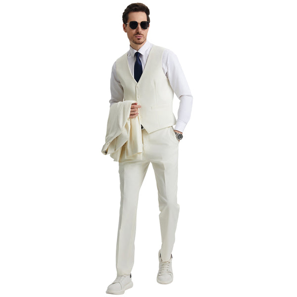 Introducing the Men's Stacy Adams Hybrid-Fit 3pc Notch Lapel Suit Set in a refined Ivory hue���a timeless embodiment of classic style and modern sophistication. Crafted by the esteemed Stacy Adams brand, this ensemble seamlessly blends tailored precision with the comfort of a modern silhouette. The jacket features a classic Notch Lapel and a Hybrid Fit, boasting functional elements like a two-button front closure, French facing, and underarm sweat guards. Complementing the jacket, the vest showcases a V-shaped design, four-button closure, and two convenient pockets, while the pants offer both comfort and style with an expandable waistband and ample storage. With its innovative Hybrid-Fit catering to slim and modern preferences, this suit ensures the ideal fit for every discerning gentleman. Experience unparalleled elegance and versatility, exclusively from Stacy Adams.