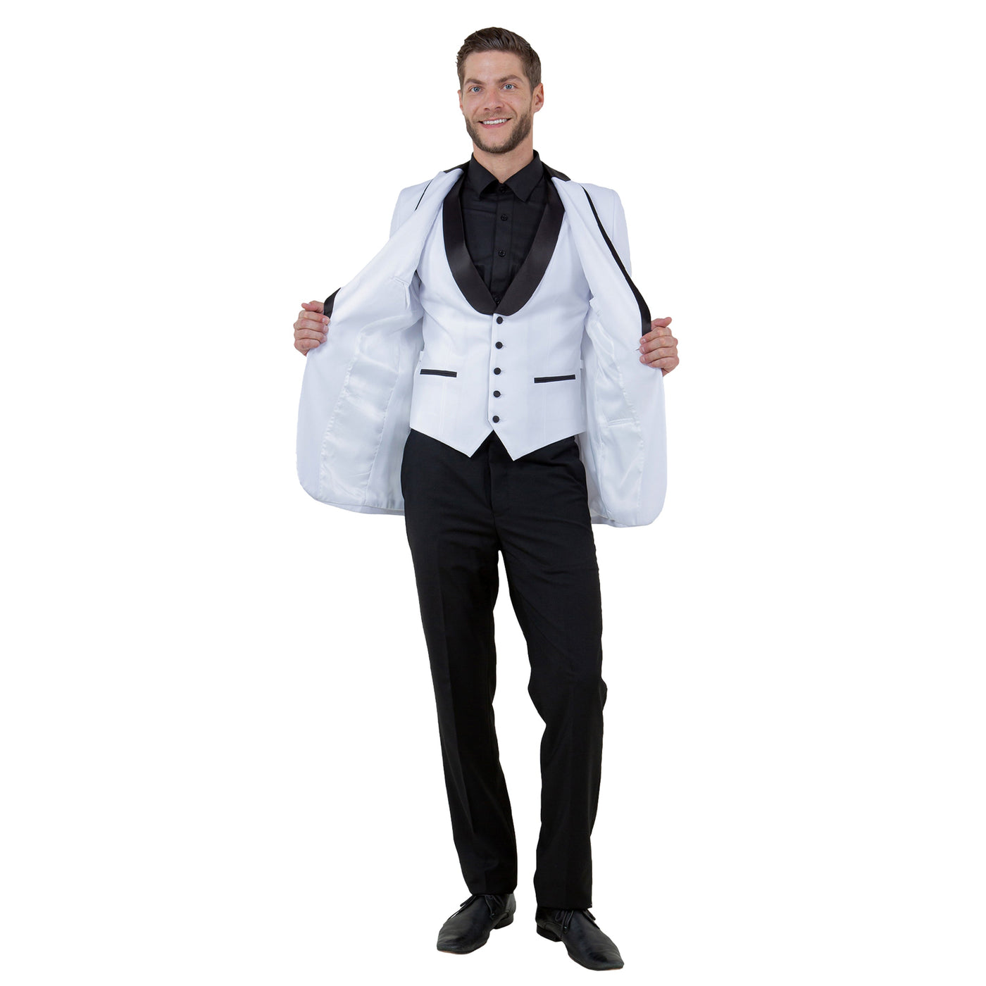 Dress to impress in pristine white with the Bryan Michaels Men's 3pc White Tuxedo, featuring a satin shawl collar and expandable clip pants. This meticulously crafted ensemble exudes sophistication, with a slim-fit jacket showcasing a peak lapel trimmed in satin, a one-button closure, and side pockets with satin detailing. The vest, adorned with a satin shawl collar and five-button closure, adds an extra layer of refinement, while the flat-front pants with a satin waistband ensure a sleek silhouette. Special features such as the satin trim peak lapel and lapel vest elevate the ensemble to new heights of elegance, making it perfect for black-tie events, weddings, and galas, where you'll undoubtedly make a memorable statement with your timeless style.