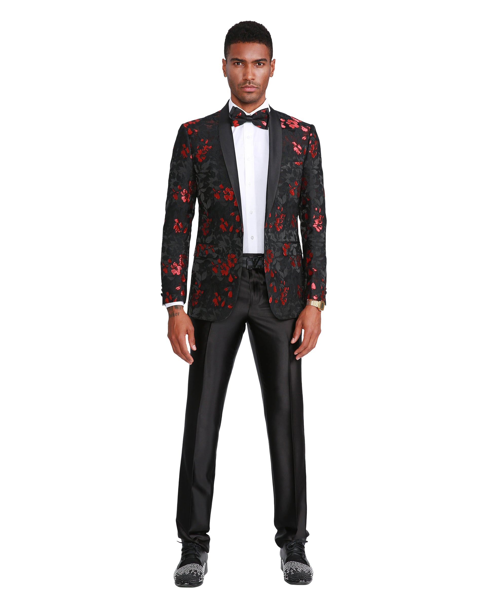 The Tazzio Men's Floral Pattern Slim-Fit Blazer brings a touch of luxury and sophistication to your wardrobe. Made from rich high quality fabric, it features a one-button front closure and a satin shawl collar for a refined look. The slim fit provides a sharp silhouette, while the interior French facing and satin-trimmed pockets add subtle elegance. Practical details include two flap front pockets, a chest pocket, three interior pockets, and underarm sweat guards for added comfort. Ideal for both formal events and dressing up your daily outfits.