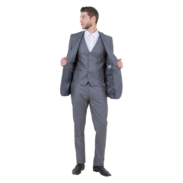 Step into sophistication with the Men's Tazzio Slim-Fit 3pc Suit in rich Grey by Tazio. Meticulously tailored, the jacket features a slim fit, slim notch lapel, and two-button closure with side vents for comfort. The coordinating vest and flat front pants complete the ensemble, boasting practicality and elegance. Perfect for formal events or business meetings, this suit ensures you make a lasting impression.