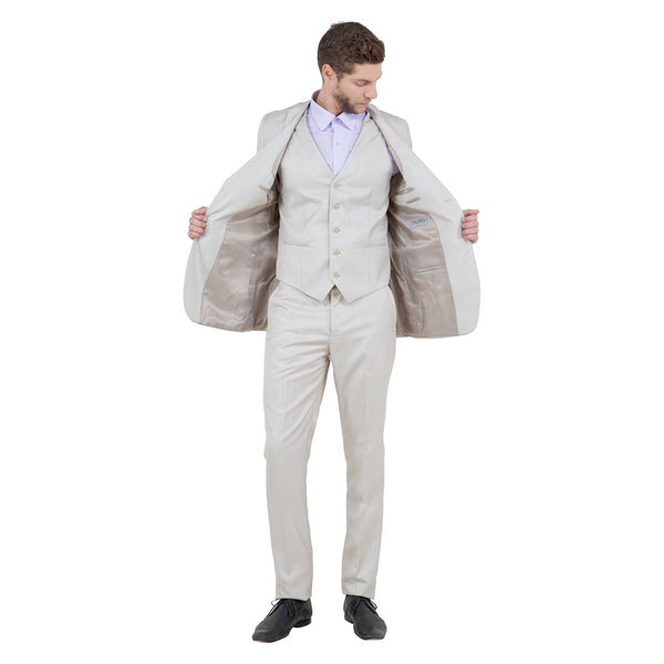 Step into sophistication with the Men's Tazzio Slim-Fit 3pc Suit in refined tan by Tazio. Meticulously tailored, the jacket features a slim fit, slim notch lapel, and two-button closure with side vents for comfort. The coordinating vest and flat front pants complete the ensemble, boasting practicality and elegance. Perfect for formal events or business meetings, this suit ensures you make a lasting impression.