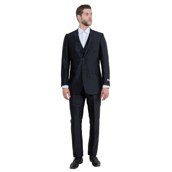 Elevate your formal attire with the Men's Tazio Slim-Fit 3pc Suit in Shiny Black. Crafted with precision by Tazio, this ensemble exudes sophistication and style. The Solid Sharkskin jacket features a Slim Fit, Two Button Front Closure, Notch Lapel, and convenient Side Vents, while the vest adds a polished touch with its Five Button closure and V Neck design. Completing the look, the coordinating Solid Sharkskin pants offer a sleek Flat Front design, 37 Inch Inseam, and practical features like back besom pockets with button closure and front angled slip pockets. Perfect for weddings, galas, or formal business events, this suit guarantees a timeless and elegant appearance with every wear.