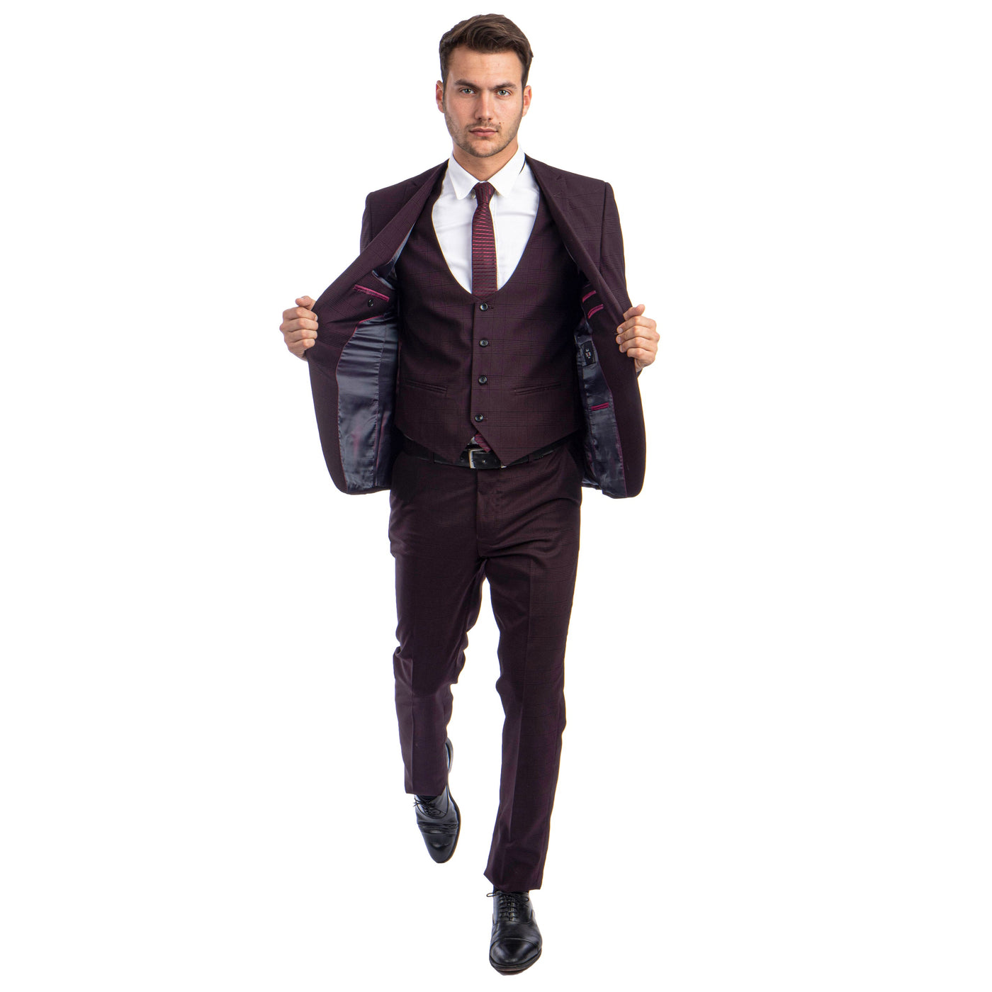 Burgundy Men's Ultra Slim-Fit 3-Piece Glen Check Suit - Burgundy / 36R / M267US-02