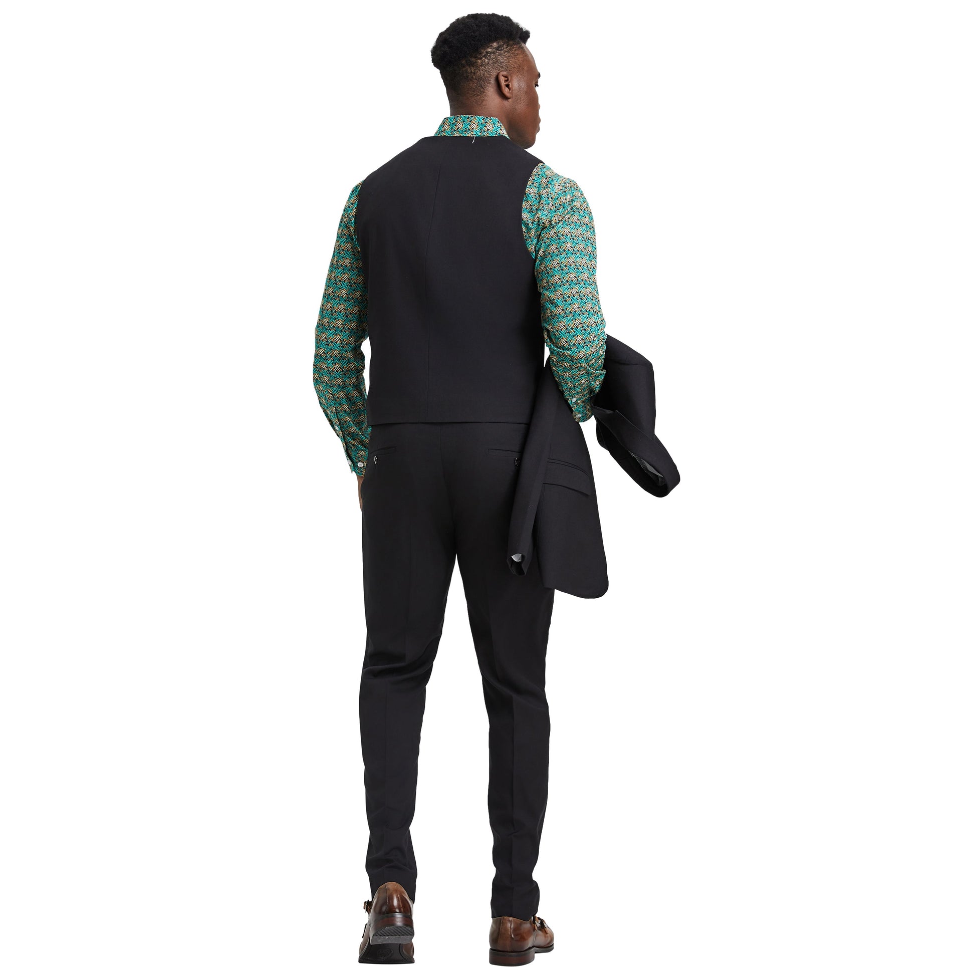 Experience timeless sophistication with the Stacy Adams Hybrid-Fit 3pc Suit Set in classic black, meticulously crafted for the modern gentleman. The solid black jacket boasts a two-button front closure, peak lapel, and underarm sweat guards, ensuring both style and comfort. Complementing the ensemble, the black U-shaped vest features a four-button closure for added refinement. The flat-front black pants, complete with an expandable waistband and functional pockets, offer unparalleled versatility. Available in slim-fit sizes 36-44 and modern-fit sizes 46-62, this black suit set caters to diverse preferences, promising a tailored look for every occasion. Unleash your confidence and sophistication with the Stacy Adams Hybrid-Fit 3pc Suit Set in black.