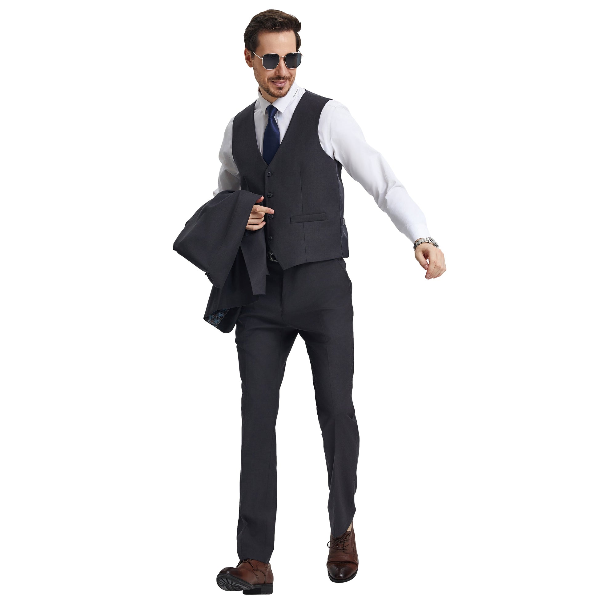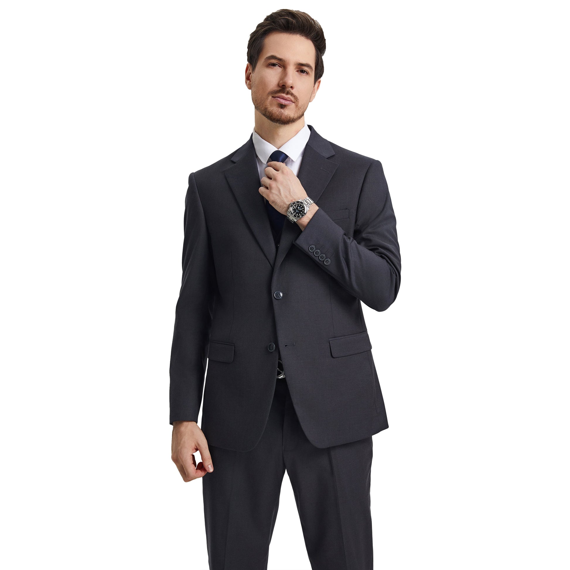 Introducing the Men's Stacy Adams Hybrid-Fit 3pc Notch Lapel Suit Set in a sophisticated charcoal hue���a timeless embodiment of refined style and modern elegance. Crafted by the esteemed Stacy Adams brand, this ensemble seamlessly blends tailored precision with the comfort of a modern silhouette. The jacket features a classic Notch Lapel and a Hybrid Fit, boasting functional elements like a two-button front closure, French facing, and underarm sweat guards. Complementing the jacket, the vest showcases a V-shaped design, four-button closure, and two convenient pockets, while the pants offer both comfort and style with an expandable waistband and ample storage. With its innovative Hybrid-Fit catering to slim and modern preferences, this suit ensures the ideal fit for every discerning gentleman. Experience unparalleled sophistication and versatility, exclusively from Stacy Adams.