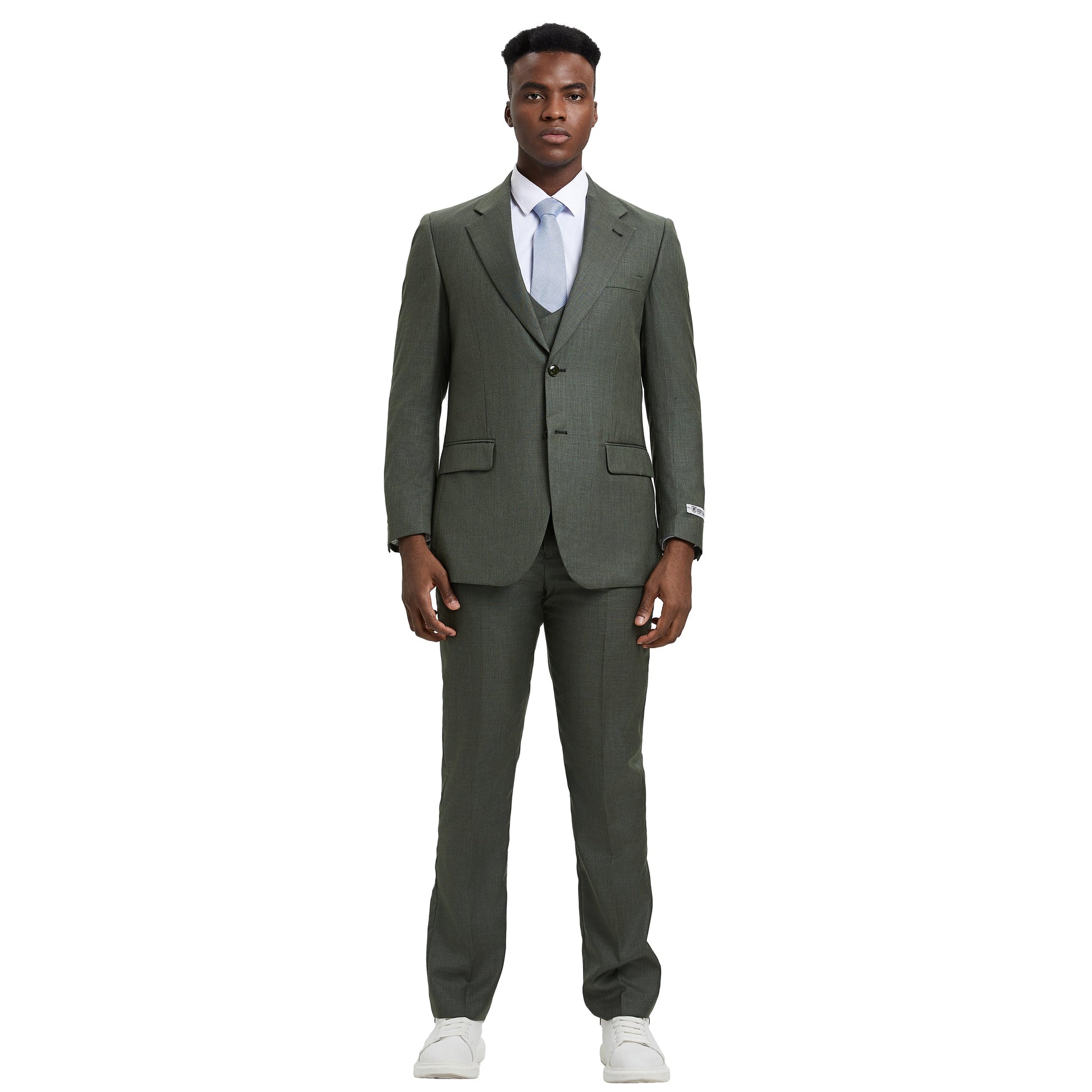 Experience elegance and versatility with the Men's Stacy Adams Sharkskin 3-Piece Olive Suit. This sophisticated ensemble features a sharkskin jacket with a two-button front closure, notch lapel, and side vents for a classic look with added comfort. The interior French facing and three pockets offer practicality, while underarm sweat guards ensure all-day comfort. The double-breasted vest adds a formal touch with a solid texture and four-button closure, while the flat-front pants maintain a sleek silhouette with two back besom pockets and two front angled slip pockets for convenience. This suit is perfect for weddings, business meetings, or any occasion where you want to make a memorable impression. Choose Stacy Adams for a timeless blend of tradition and modernity.