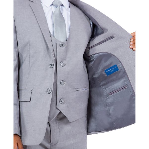 Elevate your young gentleman's style with the Perry Ellis Portfolio Boy's 5pc Solid Suit. This refined set features a single-breasted, two-button jacket with a classic notch lapel and convenient side pockets, paired with a sleek U-neck vest boasting a 4-button closure and two slit pockets. The traditional-length, single-pleat pants complete the ensemble, offering a timeless and polished look. Perfect for weddings, formal events, or any special occasion, this suit ensures your boy will look sharp and feel confident.