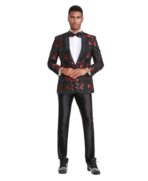 The Tazzio Men's Floral Pattern Slim-Fit Blazer brings a touch of luxury and sophistication to your wardrobe. Made from rich high quality fabric, it features a one-button front closure and a satin shawl collar for a refined look. The slim fit provides a sharp silhouette, while the interior French facing and satin-trimmed pockets add subtle elegance. Practical details include two flap front pockets, a chest pocket, three interior pockets, and underarm sweat guards for added comfort. Ideal for both formal events and dressing up your daily outfits.