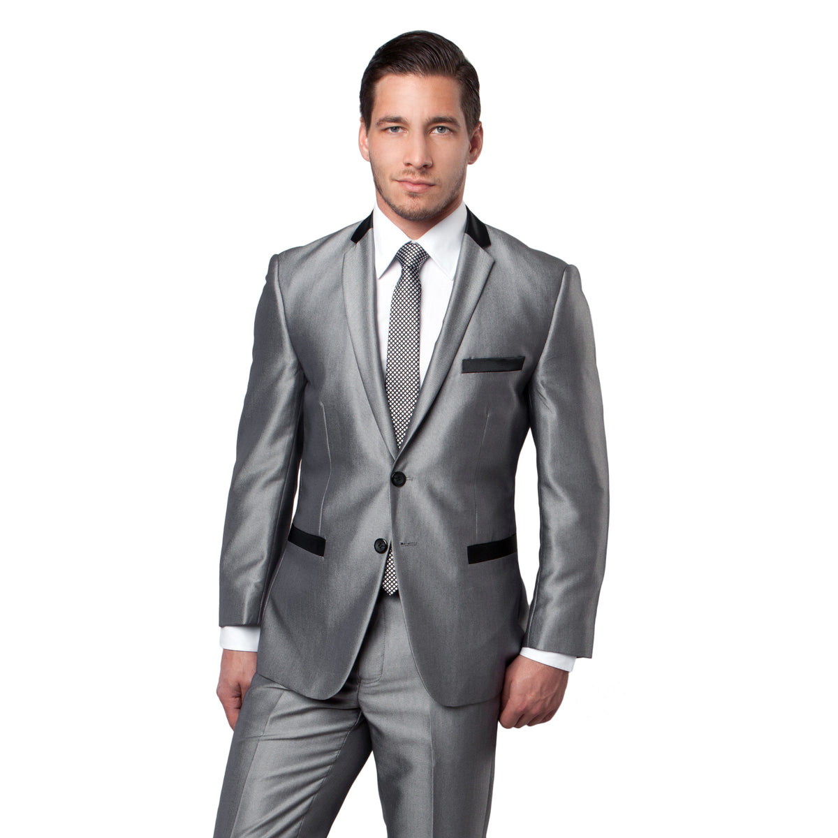 Black Tone on Tone Shiny 2-PC Slim Fit Suits - Silver / 38R/32W / M201S-03