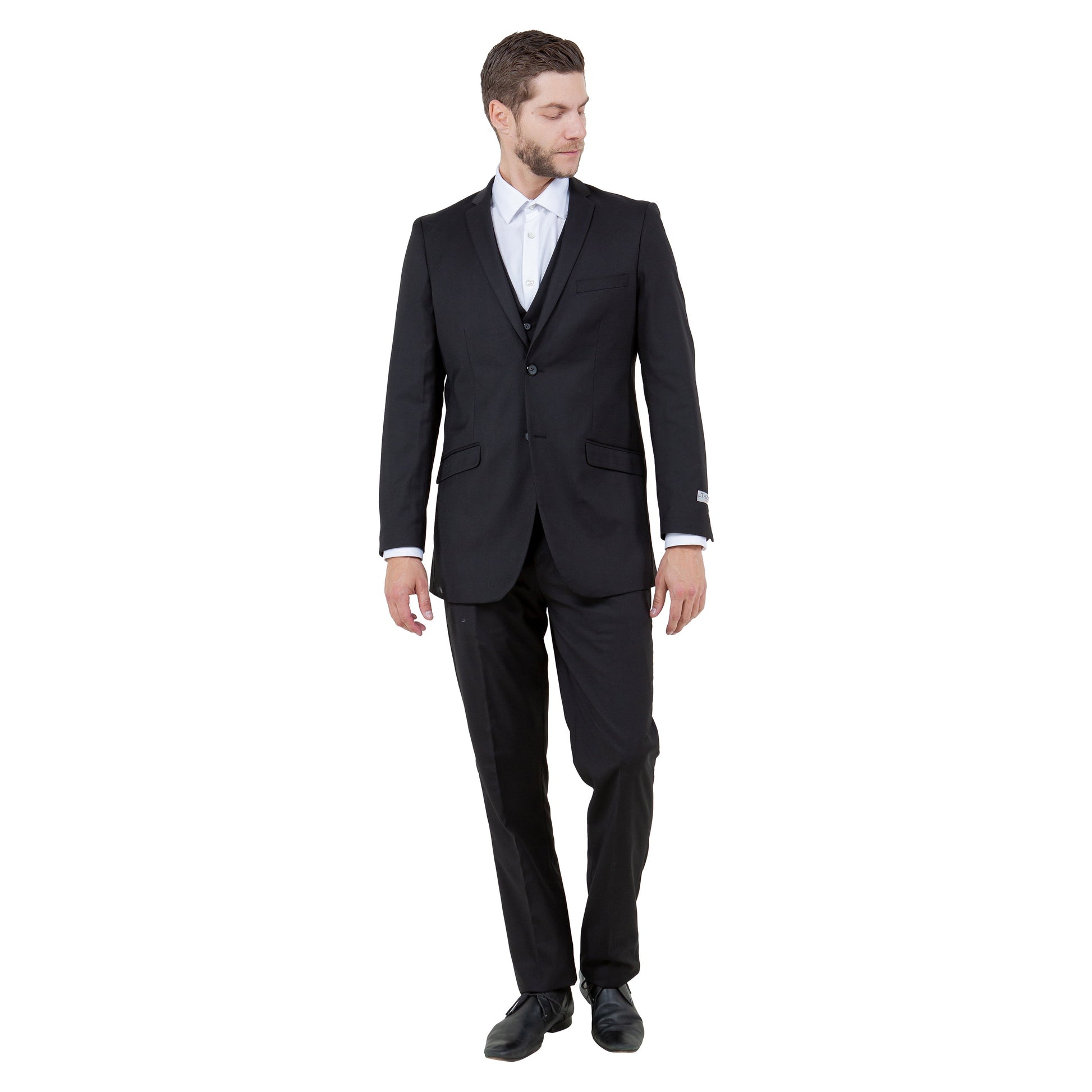 Step into sophistication with the Men's Tazzio Slim-Fit 3pc Suit in timeless black by Tazio. Meticulously tailored, the jacket features a slim fit, slim notch lapel, and two-button closure with side vents for comfort. The coordinating vest and flat front pants complete the ensemble, boasting practicality and elegance. Perfect for formal events or business meetings, this suit ensures you make a lasting impression.