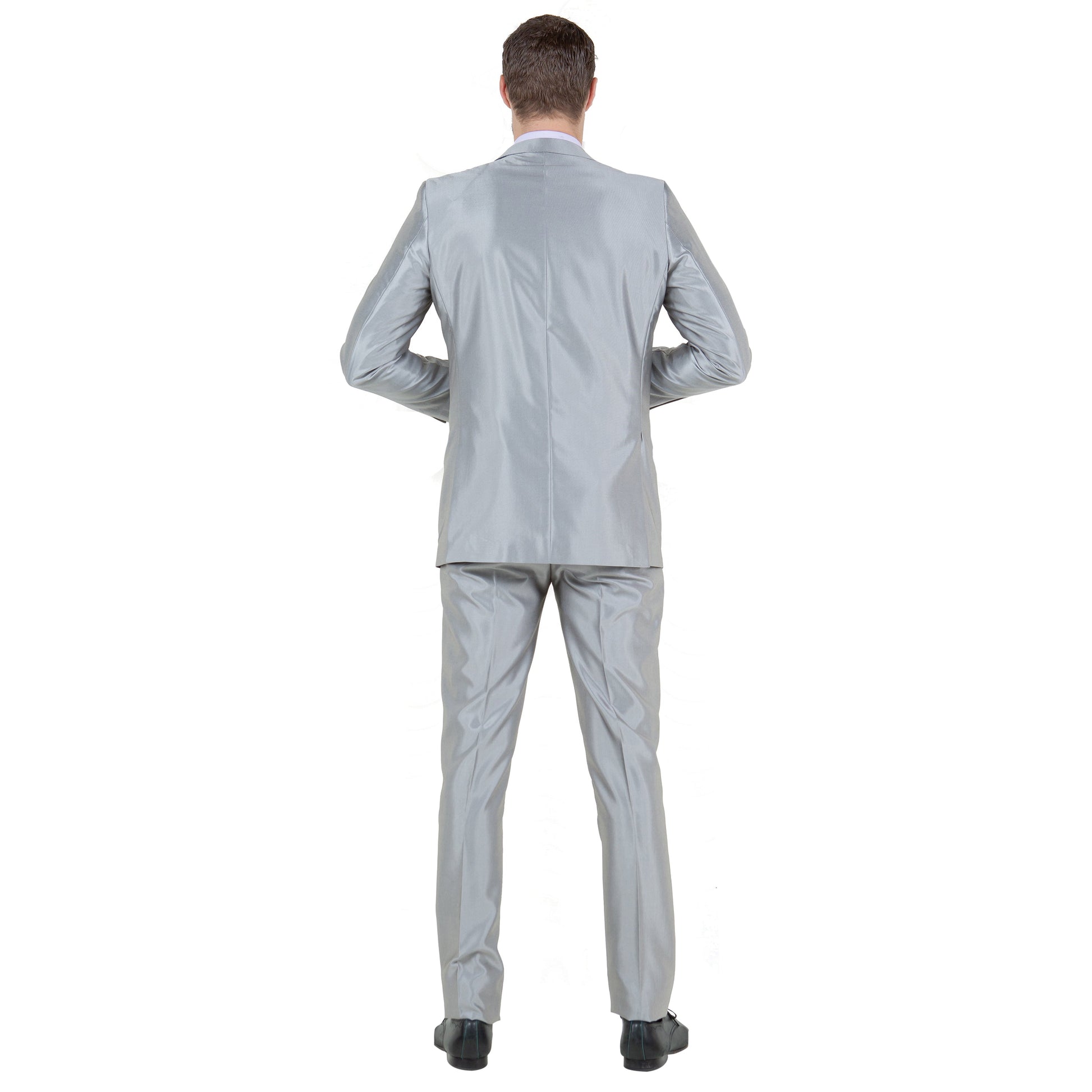 Elevate your formal attire with the Men's Tazio Slim-Fit 3pc Suit in Silver. Crafted with precision by Tazio, this ensemble exudes sophistication and style. The Solid Sharkskin jacket features a Slim Fit, Two Button Front Closure, Notch Lapel, and convenient Side Vents, while the vest adds a polished touch with its Five Button closure and V Neck design. Completing the look, the coordinating Solid Sharkskin pants offer a sleek Flat Front design, 37 Inch Inseam, and practical features like back besom pockets with button closure and front angled slip pockets. Perfect for weddings, galas, or formal business events, this suit guarantees a timeless and elegant appearance with every wear.