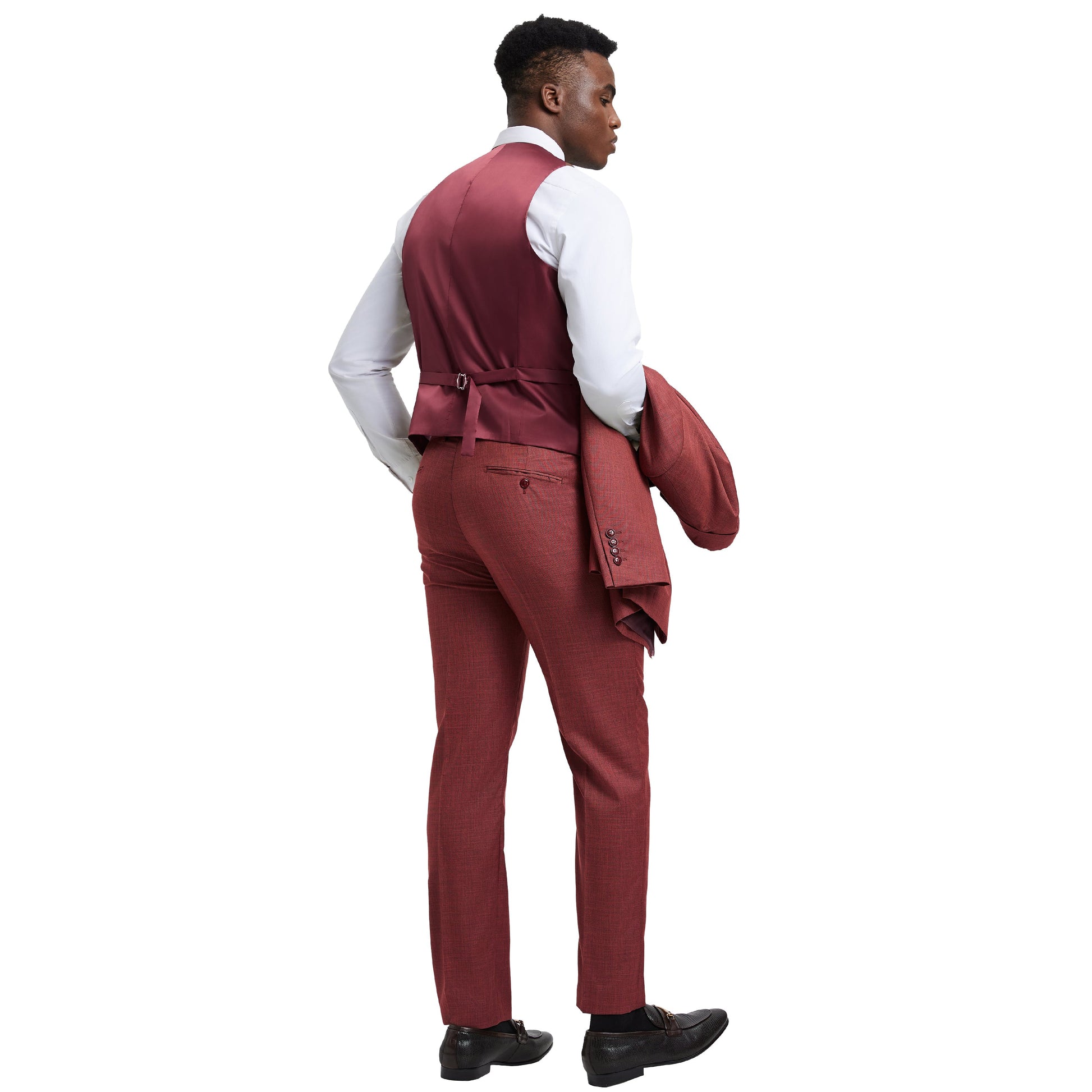 Experience elegance and versatility with the Men's Stacy Adams Sharkskin 3-Piece Cranberry Suit. This sophisticated ensemble features a sharkskin jacket with a two-button front closure, notch lapel, and side vents for a classic look with added comfort. The interior French facing and three pockets offer practicality, while underarm sweat guards ensure all-day comfort. The double-breasted vest adds a formal touch with a solid texture and four-button closure, while the flat-front pants maintain a sleek silhouette with two back besom pockets and two front angled slip pockets for convenience. This suit is perfect for weddings, business meetings, or any occasion where you want to make a memorable impression. Choose Stacy Adams for a timeless blend of tradition and modernity.