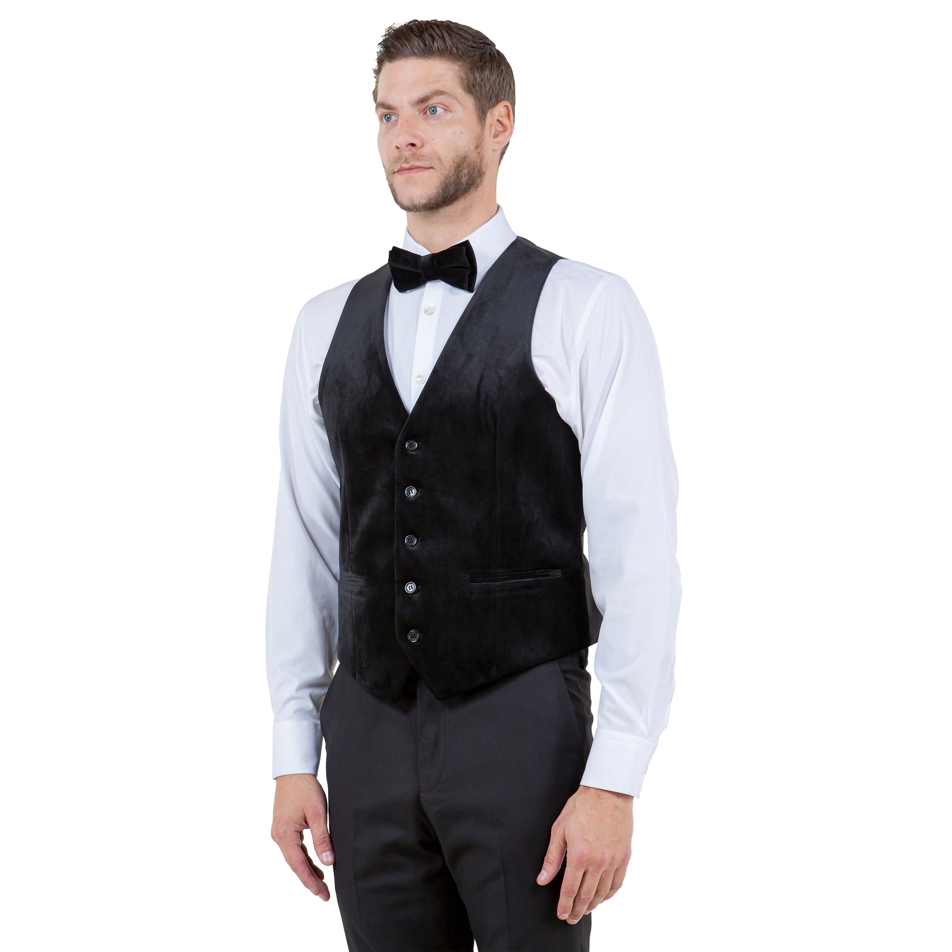 Add a touch of sophistication with the Tazzio Men's Slim-Fit Velvet Vest. Featuring a V-neck finish and crafted from solid velvet, this vest offers a refined look with a slim-fit design that runs a bit short. For the best fit, we recommend sizing up. It includes a 5-button closure, 2 welt pockets, and an adjustable strap for a tailored, comfortable fit. Mix and match it with our Velvet Jacket and Pants Separates to create a versatile, stylish ensemble.
